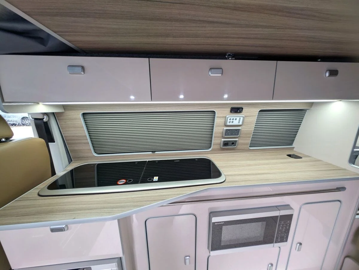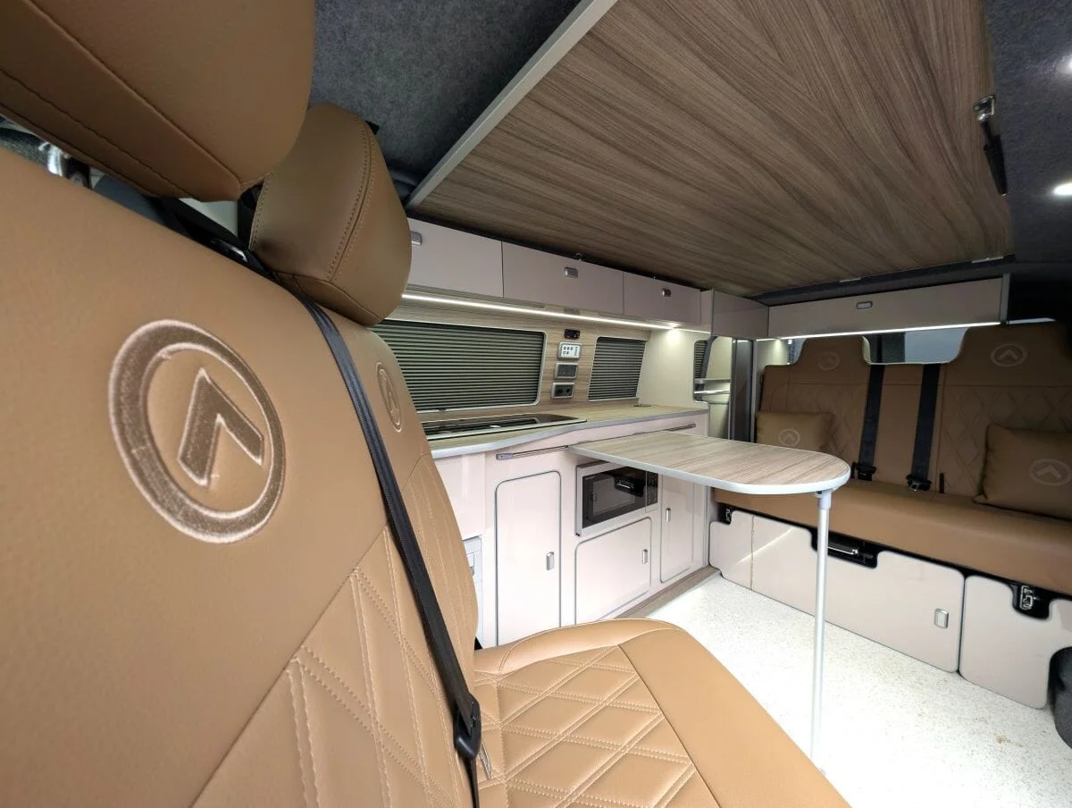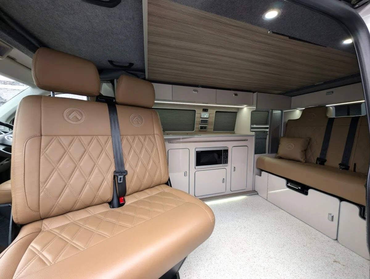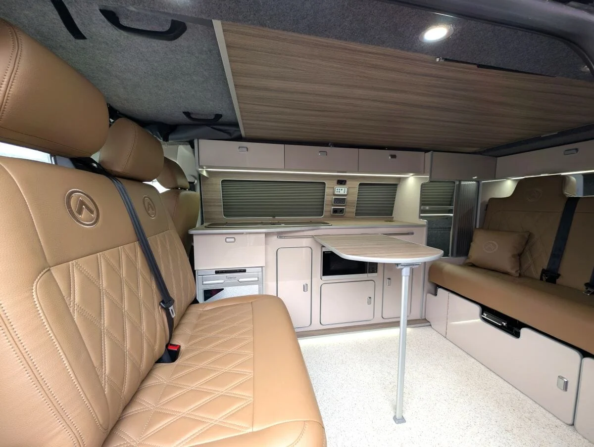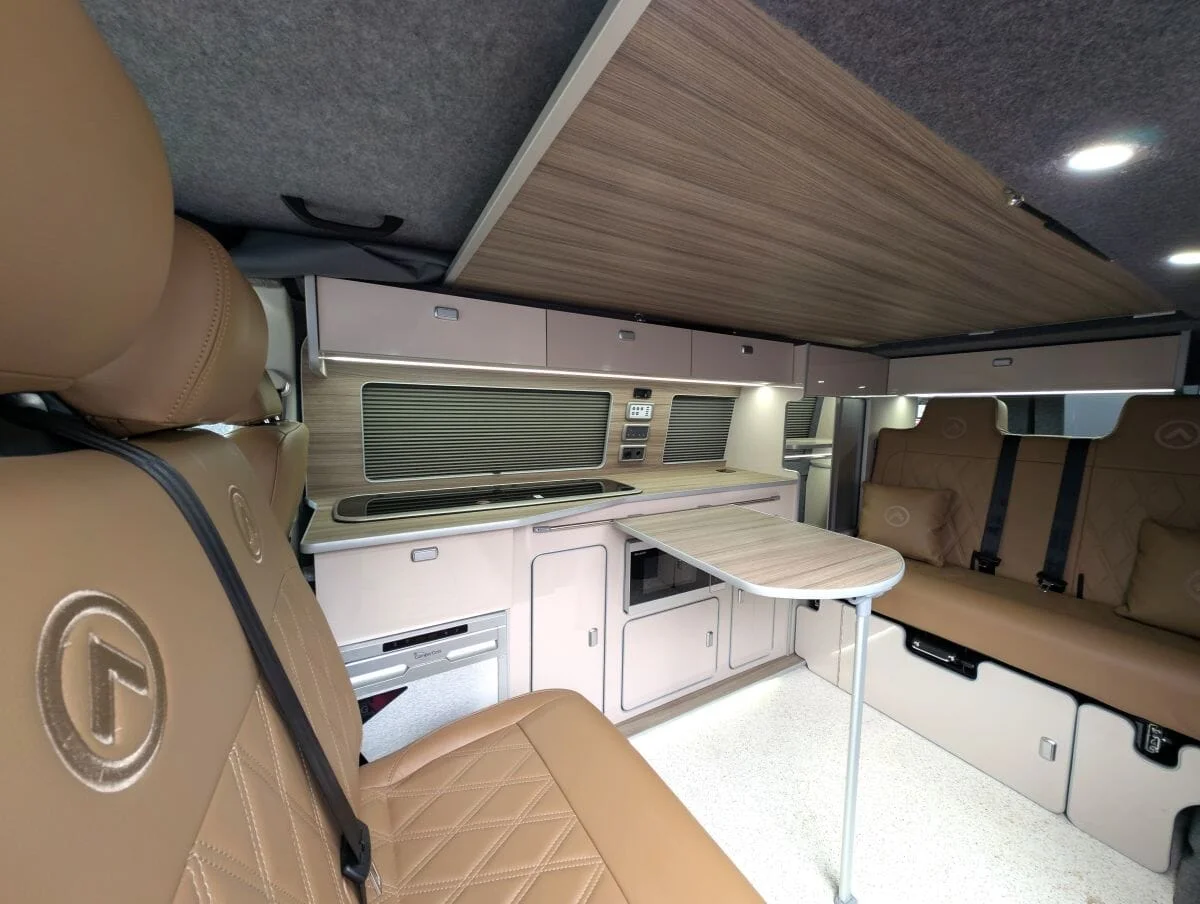 Inside, the van boasts winter-grade flooring, a stylish latte and driftwood kitchen, and premium liquor upholstery, creating a warm and modern living space. Thoughtfully designed storage, quality appliances, and a versatile layout make day-to-day van life both functional and relaxing.