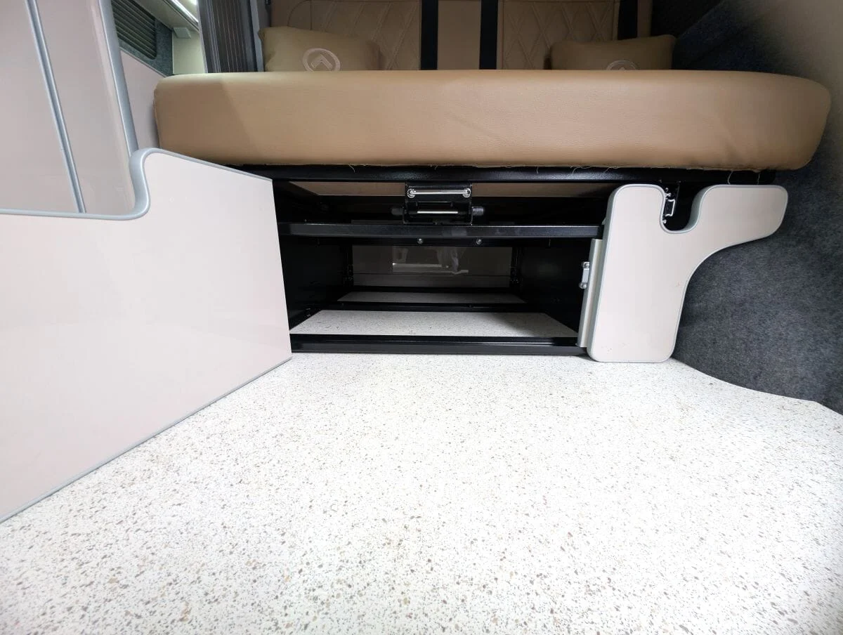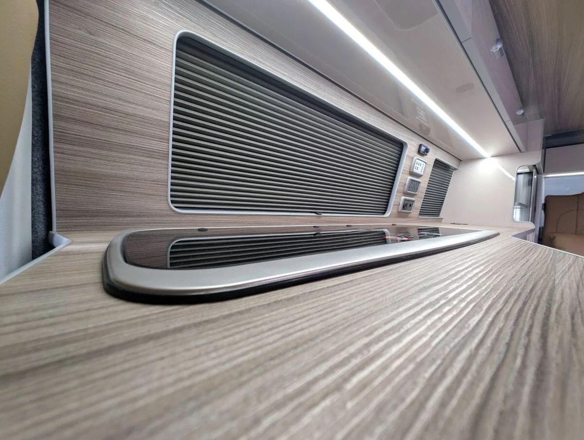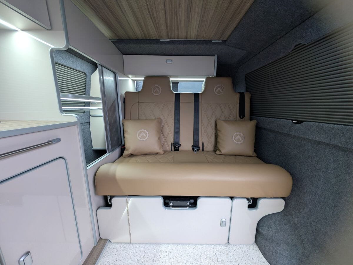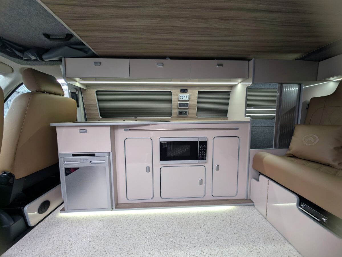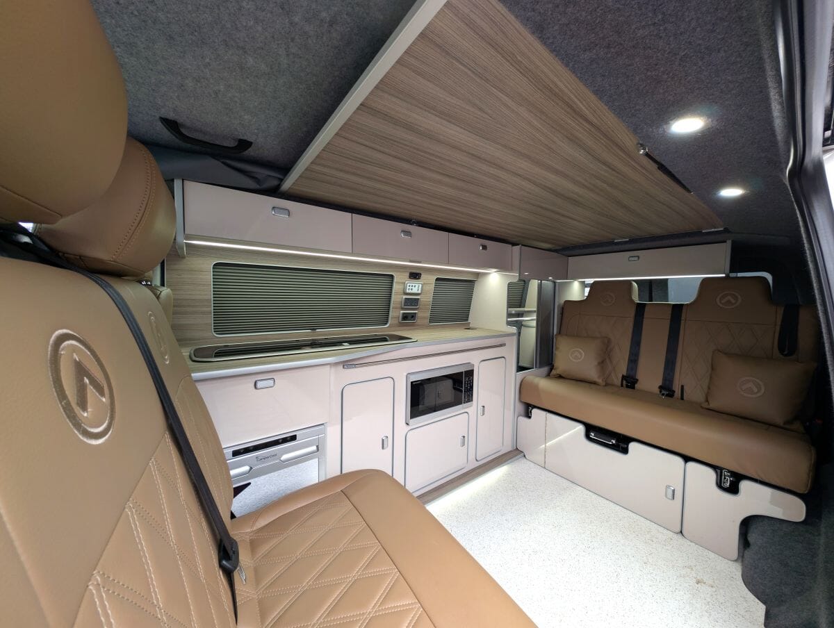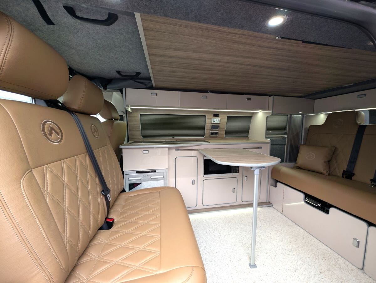 Inside, the van boasts winter-grade flooring, a stylish latte and driftwood kitchen, and premium liquor upholstery, creating a warm and modern living space. Thoughtfully designed storage, quality appliances, and a versatile layout make day-to-day van life both functional and relaxing.