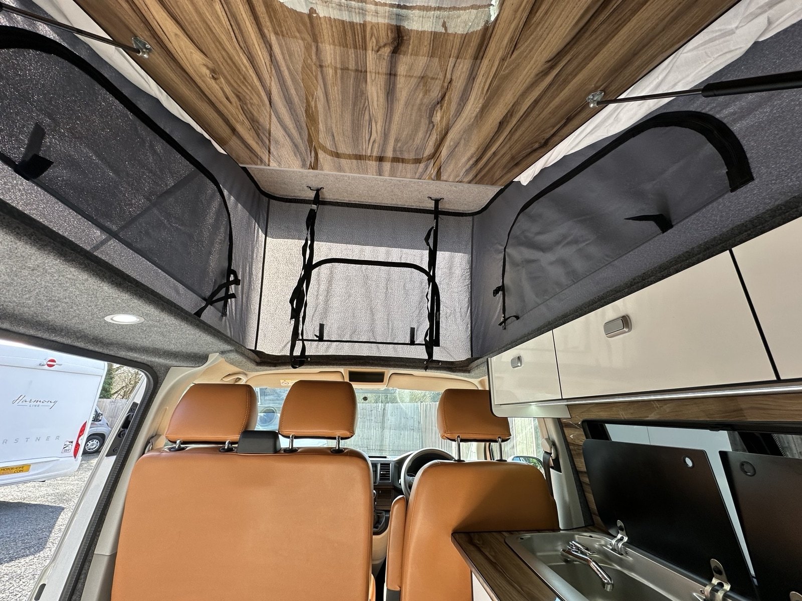 Inside, the conversion features durable winter flooring, a sleek white gloss and Noche Marino kitchen, and comfortable fudge upholstery, creating a warm and inviting space that’s ready to use.